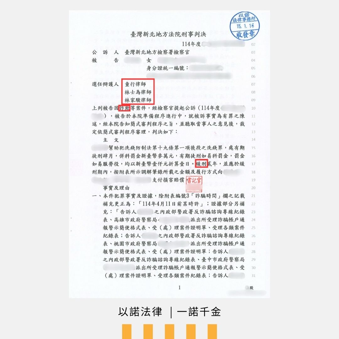 當事人原本堅持拚無罪,但以諾團隊深入分析後,帶領他看清現實:交付帳戶在實務上極難撇清責任,且被害人財產確實因此流失。