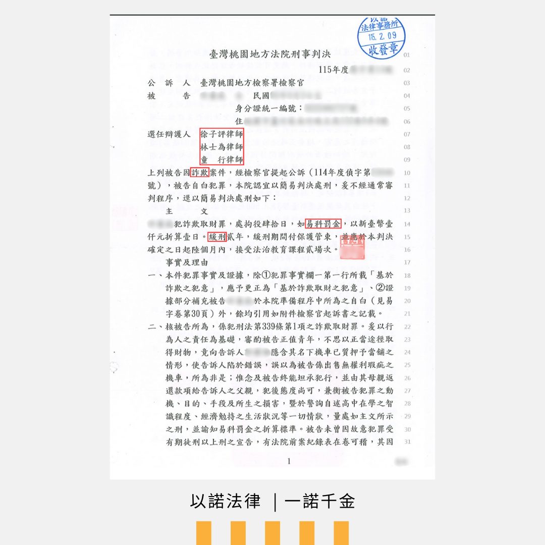法院綜合考量律師提出的辯護意見,以及當事人主動還款、認罪等優良犯後態度,最終做出人性化的判決:判處拘役得易科罰金,並宣告緩刑。當事人得以在專業法律的引導下,爭取到最有利且人性化的處理結果,保住原本的生活軌道。