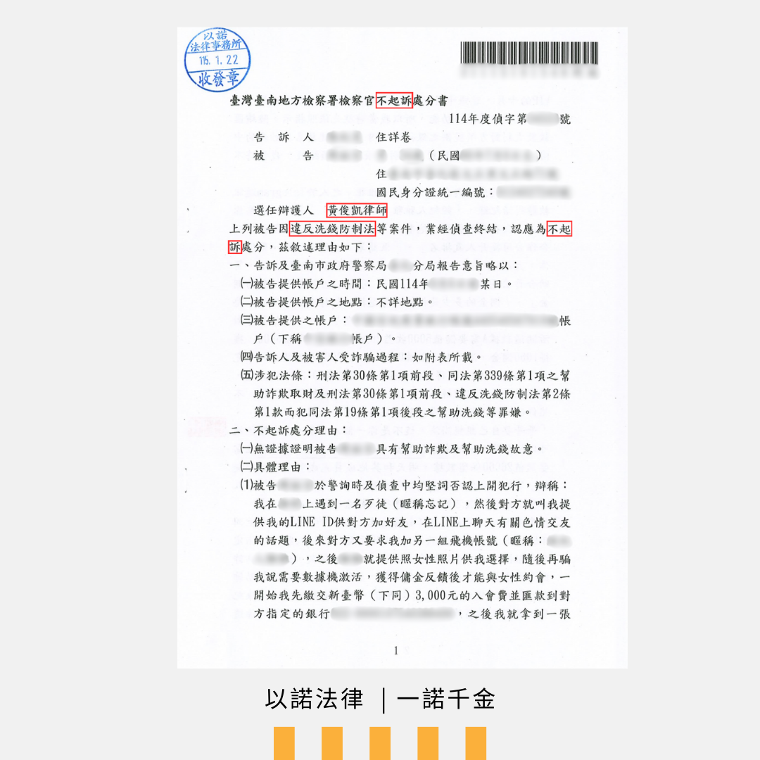 🏆 最終戰果:成功爭取不起訴處分! 在律師積極爭取下,檢方採信我方主張,認定委託人並無幫助洗錢的動機,給予不起訴處分。這不僅保住清白,更讓他免於刑事前科,從陷阱中全身而退。