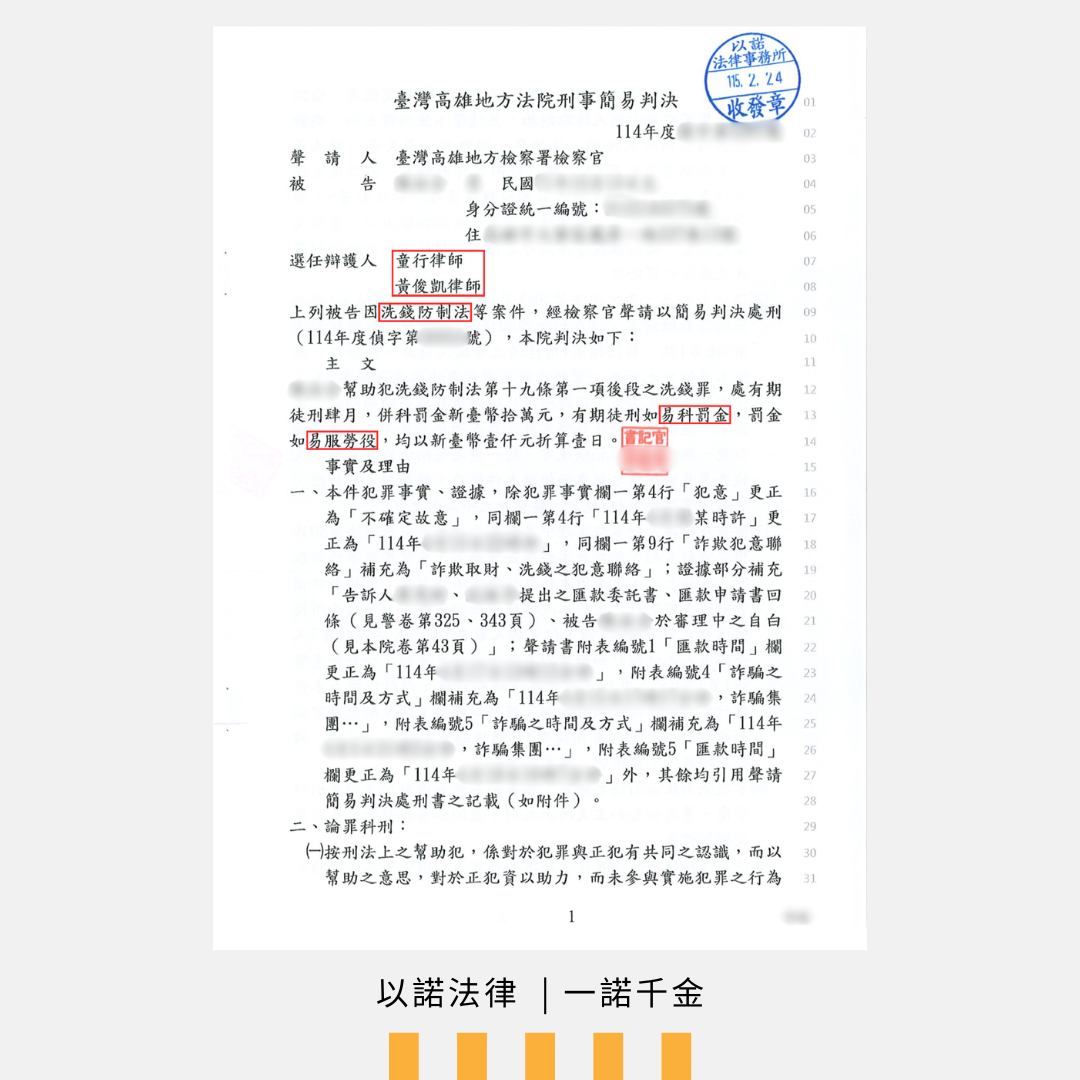 ⚖️ 以諾律師團隊:迅速釐清、精準辯護 接手案件後,律師團隊第一時間分析通訊紀錄,還原委託人受騙的心路歷程。我們擬定最有利的訴訟策略,在庭上明確論證當事人的主觀認知落差,成功爭取法官的同理與量刑空間。