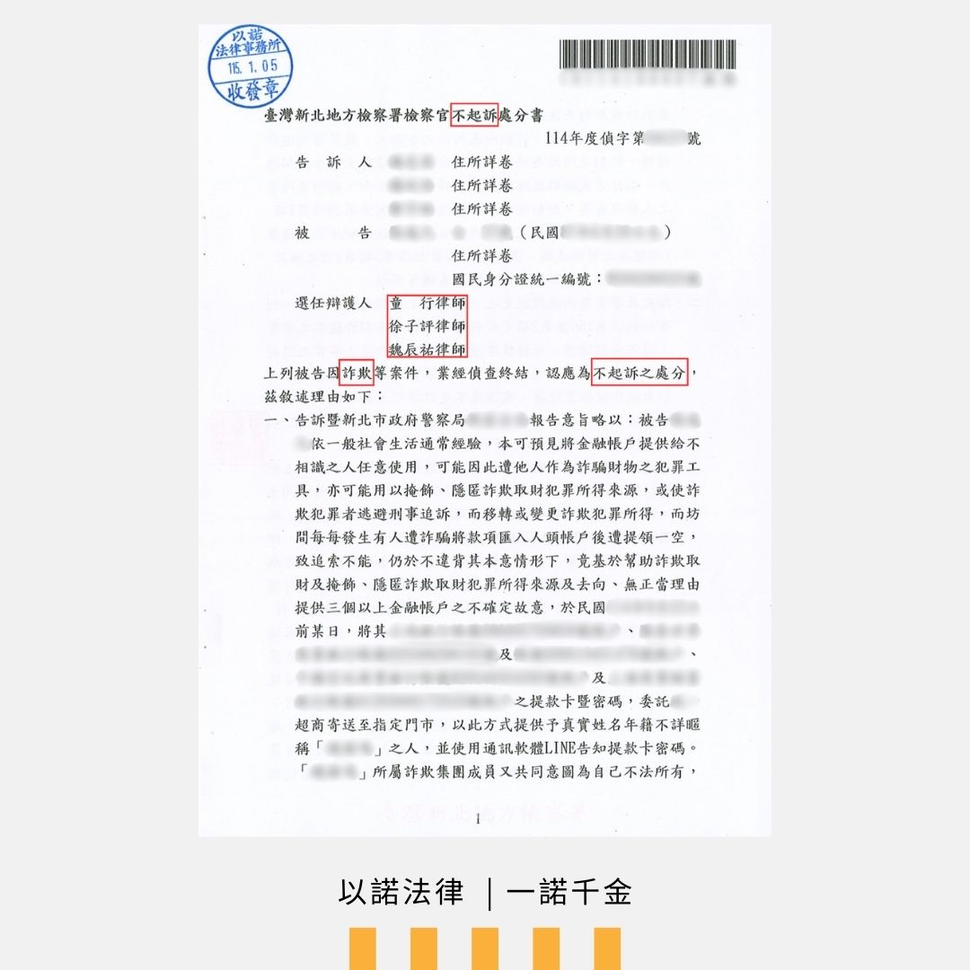 🏆 最終結果:不起訴處分! 檢察官採信律師專業見解,認定無犯罪犯意,成功還給當事人清白。